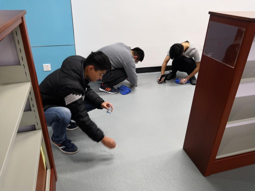 同学们陆续到达志愿者地点后,管理老师给每个参加志愿者活动的同学分配了任务。同学们被分为几个小组,一部分负责擦拭自习桌,一部分负责拖洗地面,一部分负责处理地上的难以除去的固渍,大家各司其职,每个人都忙的不可开交。忙忙碌碌之中常常传来大家的欢声笑语,弥漫了整个图书馆,带来丝丝温暖。